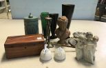 Jewelry bow, decorative urns 11"h., resin child bust, LLadro Angels (chipped wing) and bells, silver plate candle holder and dish. Jewelry bow, decorative urns 11"h., resin child bust, LLadro Angels (chipped wing) and bells, silver plate candle holder and dish.