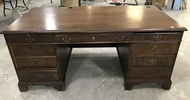 York Stowe & Davis Furniture Company Executive Desk/lawyer's desk, knee hole, is worn condition, has computer cord holes, side drawers, file cabinets, 30"h., 69"w., 36"d. York Stowe & Davis Furniture Company Executive Desk/lawyer's desk, knee hole, is worn condition, has computer cord holes, side drawers, file cabinets, 30"h., 69"w., 36"d.