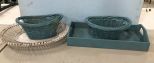 Painted wood handled tray 25"L., two blue painted baskets and white painted basket decor. Painted wood handled tray 25"L., two blue painted baskets and white painted basket decor.