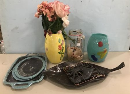 Plated Silver Plated tray and dishes, Pottery yellow flower vase, Large glass jar, painted glass vase, leaf metal tray, rooster emblem. Plated Silver Plated tray and dishes, Pottery yellow flower vase, Large glass jar, painted glass vase, leaf metal tray, rooster emblem.