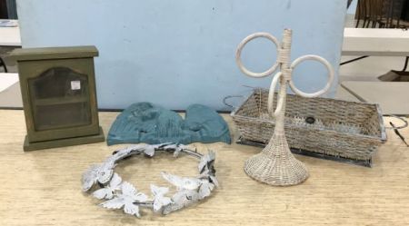 Painted metal woven basket 18"w., white painted wicker rack, painted butterfly metal decor, polyfoam painted Eagle plaque, small painted display cabinet 12"h. Painted metal woven basket 18"w., white painted wicker rack, painted butterfly metal decor, polyfoam painted Eagle plaque, small painted display cabinet 12"h.