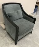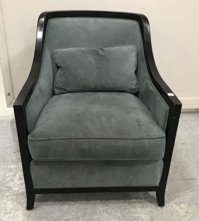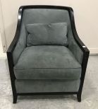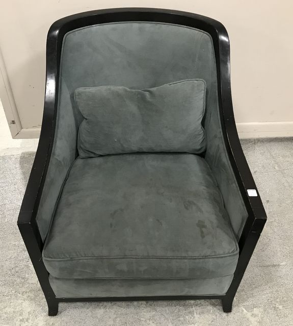 Bernhardt Interiors Upholstered Arm Chair, grey fabric, needs cleaning, black painted wood frame, 34"h. Bernhardt Interiors Upholstered Arm Chair, grey fabric, needs cleaning, black painted wood frame, 34"h.