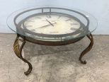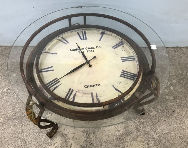 Rustic Metal Round Coffee Table, round glass top, Madison Clock with battery power, 18"h., 29"dia. Rustic Metal Round Coffee Table, round glass top, Madison Clock with battery power, 18"h., 29"dia.