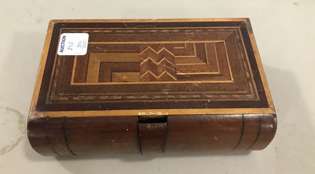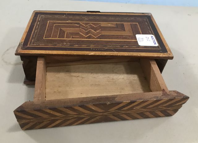 Antique inlaid wood layers, pretty design, spring loaded hidden drawer, latch, has some finish wear, 5"w., 8"L. Antique inlaid wood layers, pretty design, spring loaded hidden drawer, latch, has some finish wear, 5"w., 8"L.