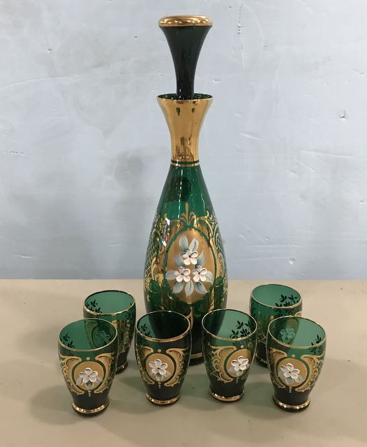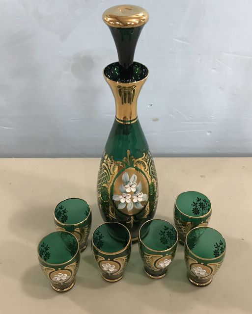 Bohemian glass enamel floral decorative decanter, gold trim artwork with stopper 9"h., matching 6 shot glasses, floral painted design, good condition. Bohemian glass enamel floral decorative decanter, gold trim artwork with stopper 9"h., matching 6 shot glasses, floral painted design, good condition.