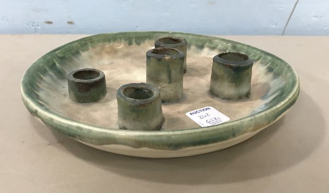 McCarty pipe candle plate, signed, five slots, 9"dia. McCarty pipe candle plate, signed, five slots, 9"dia.