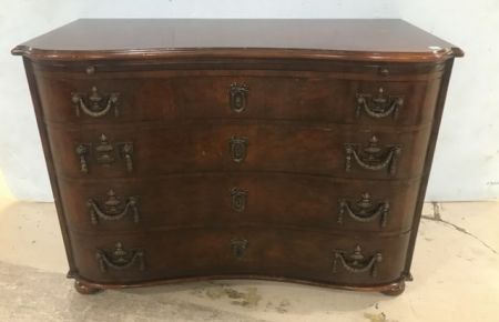 Antique Reproduction French Bow Front Chest of Drawers, leather top slide out tray, four drawers, urn design pulls, missing one handle, minor nicks on finish, banded design top, 35"h., 48"w., 20"d. Antique Reproduction French Bow Front Chest of Drawers, leather top slide out tray, four drawers, urn design pulls, missing one handle, minor nicks on finish, banded design top, 35"h., 48"w., 20"d.