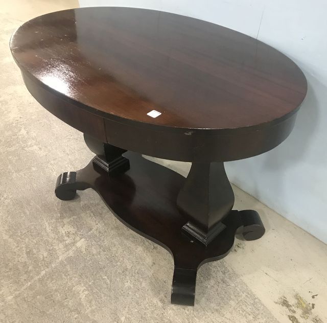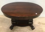 Mahogany Empire Style Oval Library Table, single drawer, dark finish, double pedestal, two tier on feet, 30"h., 42"w., 27"d. Mahogany Empire Style Oval Library Table, single drawer, dark finish, double pedestal, two tier on feet, 30"h., 42"w., 27"d.