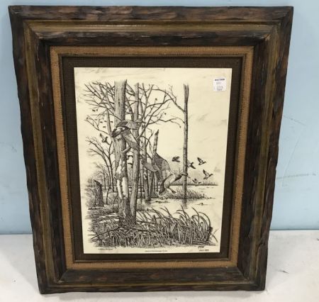 Salute to The Mississippi Flyway Copy, replica etching by Gray, 39/1700, Collectors Art Limited, carved wood frame 25"h., 21"w. Salute to The Mississippi Flyway Copy, replica etching by Gray, 39/1700, Collectors Art Limited, carved wood frame 25"h., 21"w.