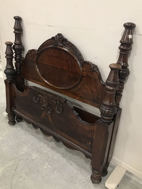 Vintage 1920's Jacobean Style Full Size Bed, carved trim work, walnut, wood rails, on wheels, mini post, 57"h., 55"w. Vintage 1920's Jacobean Style Full Size Bed, carved trim work, walnut, wood rails, on wheels, mini post, 57"h., 55"w.