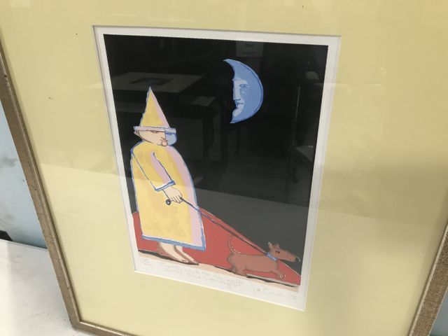 "Sporty Went For His Walk In The Blue Moonlight" Signed Martin LaBorde New Orleans artist , Serigraph, number 134/200, 1998, framed, 26"h., 20"w, sales for 400.00 in Gallery. "Sporty Went For His Walk In The Blue Moonlight" Signed Martin LaBorde New Orleans artist , Serigraph, number 134/200, 1998, framed, 26"h., 20"w, sales for 400.00 in Gallery.