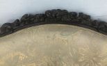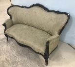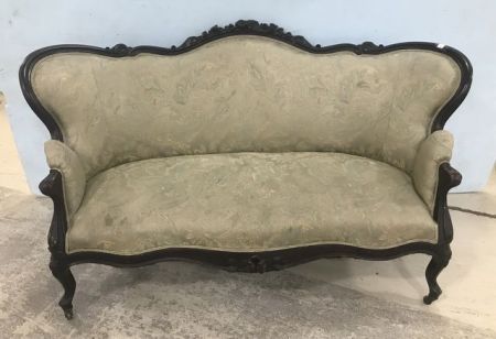 Antique Carved Victorian Style Sofa, carved flowers, on wheels, average condition upholstery, with pillows, dark finish, 36"h., 65"w. Antique Carved Victorian Style Sofa, carved flowers, on wheels, average condition upholstery, with pillows, dark finish, 36"h., 65"w.