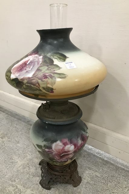 Vintage hand painted floral glass lamp and globe, with hurricane shade, electrified, metal base, slight tilt on globe base, small chip on top edge globe, 23"h. Vintage hand painted floral glass lamp and globe, with hurricane shade, electrified, metal base, slight tilt on globe base, small chip on top edge globe, 23"h.
