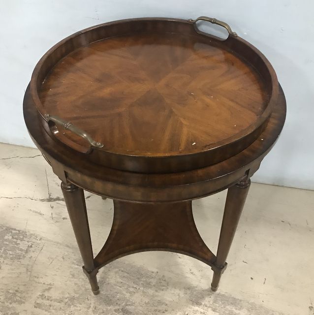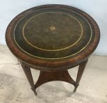 Maitland Smith Modern round accent table, with serving tray, leather inlay top, two tier, banded trim designs, brass cap feet, 29"h., 26"dia. Maitland Smith Modern round accent table, with serving tray, leather inlay top, two tier, banded trim designs, brass cap feet, 29"h., 26"dia.