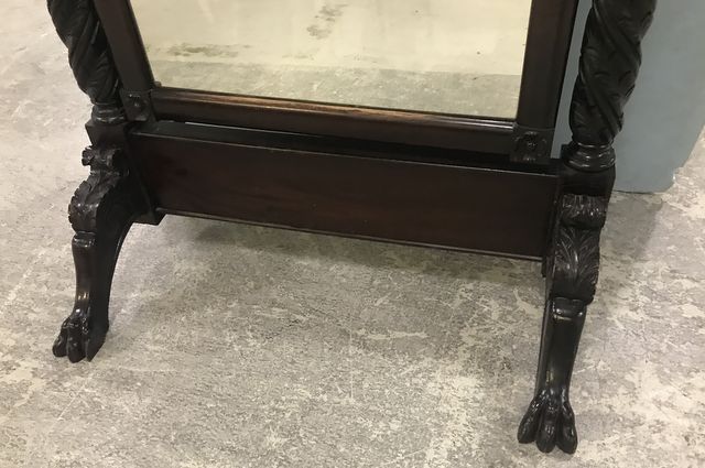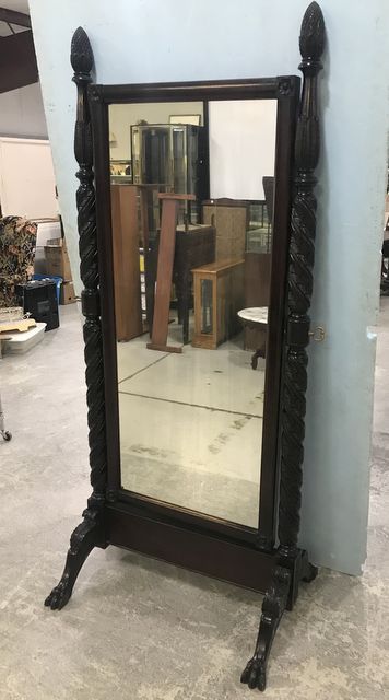 Antique Reproduction Carved Chevel Mirror, dark finish, ornate carved, claw feet (one missing section), acorn carved finials, 79"h., 32"w. Antique Reproduction Carved Chevel Mirror, dark finish, ornate carved, claw feet (one missing section), acorn carved finials, 79"h., 32"w.
