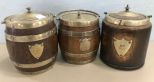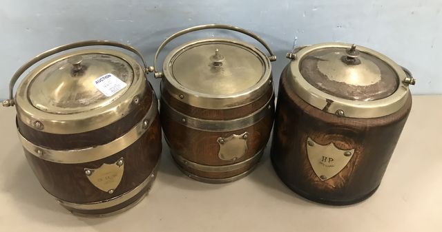 Edwardian Style English Oak Biscuit Barrels, 3 total, late to mid 1900's, monogrammed name plate, porcelain lining, has some wear, 6"h., 5"dia. Edwardian Style English Oak Biscuit Barrels, 3 total, late to mid 1900's, monogrammed name plate, porcelain lining, has some wear, 6"h., 5"dia.