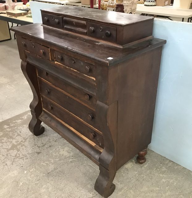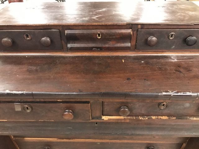 Flame mahogany Empire 9 drawer chest, has veneer issues, needs works, 48"h., 45"w., 21"d. Flame mahogany Empire 9 drawer chest, has veneer issues, needs works, 48"h., 45"w., 21"d.