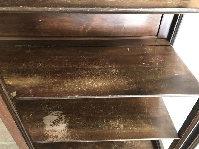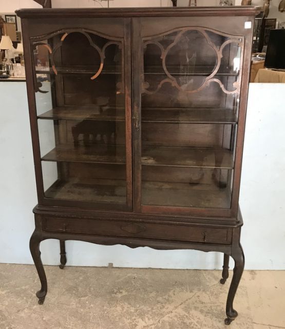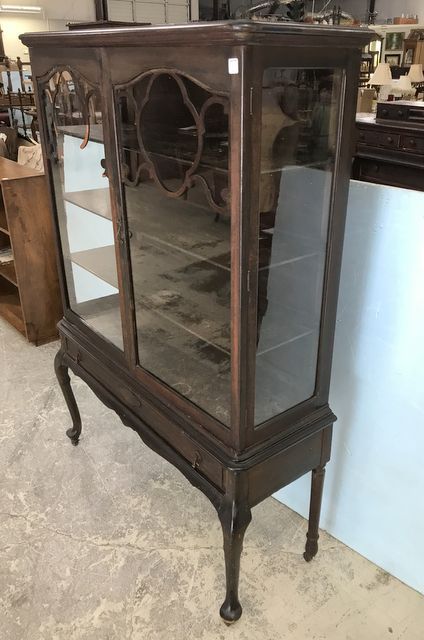 1930's Queen Anne China Cabinet, double glass door, three wood shelves, one flatware drawer, has faded and worn finish spots and missing wood trim work on left glass door, 63"h., 43"w., 14"d. 1930's Queen Anne China Cabinet, double glass door, three wood shelves, one flatware drawer, has faded and worn finish spots and missing wood trim work on left glass door, 63"h., 43"w., 14"d.