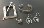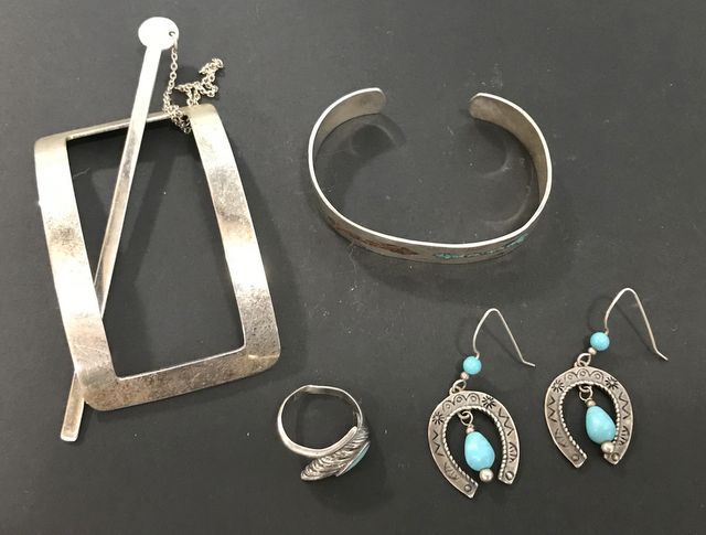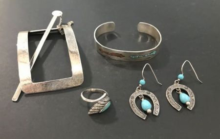 .925 hair pin, Southwest style .925 horseshoe earrings, .925 ring size 6, Southwest style bracelet, no silver mark. .925 hair pin, Southwest style .925 horseshoe earrings, .925 ring size 6, Southwest style bracelet, no silver mark.