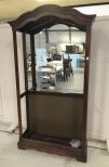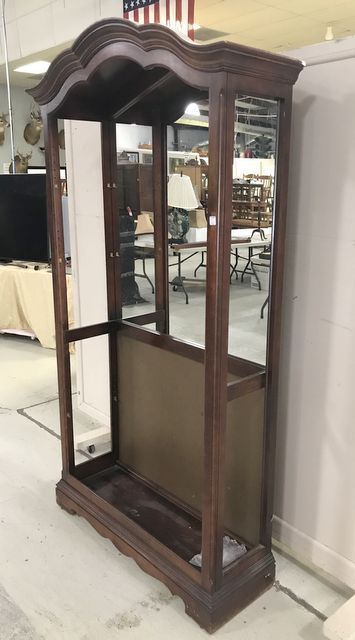 Modern Open Front Display Curio Cabinet, glass shelves, mirrored back, missing one section of mirror on bottom panel, open side, lighted, has some wear, 82"h., 40"w., 13"d. Modern Open Front Display Curio Cabinet, glass shelves, mirrored back, missing one section of mirror on bottom panel, open side, lighted, has some wear, 82"h., 40"w., 13"d.