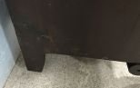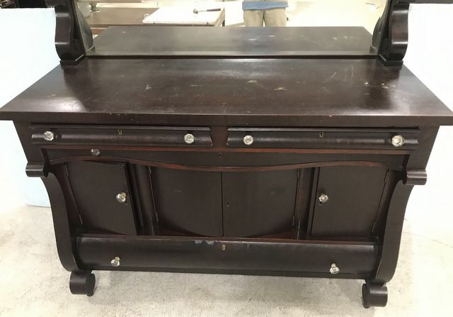 Antique Empire Style Sideboard, dark finish, beveled back splash mirror, two drawers, middle doors, bottom drawer, on wheels, one leg needs repair, 55"h., 58"w., 22"d. Antique Empire Style Sideboard, dark finish, beveled back splash mirror, two drawers, middle doors, bottom drawer, on wheels, one leg needs repair, 55"h., 58"w., 22"d.