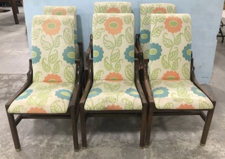 Six Vintage Oriental Style Henredon Dinning Chairs, two arms, four sides, brass cap feet, has some finish wear, sunflower fabric, 42"h. Six Vintage Oriental Style Henredon Dinning Chairs, two arms, four sides, brass cap feet, has some finish wear, sunflower fabric, 42"h.