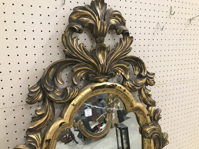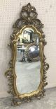 Modern Decor Gold Gilt Ornate Wall Mirror, gold gilt antiqued, ornate frame, beveled mirror but has crack on top of mirror, 69"h., 27"w. Modern Decor Gold Gilt Ornate Wall Mirror, gold gilt antiqued, ornate frame, beveled mirror but has crack on top of mirror, 69"h., 27"w.