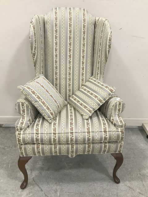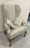 High Back Winged Arm Chair, Queen Anne Legs, Striped fabric (good condition), two accent matching pillows, 50"h. High Back Winged Arm Chair, Queen Anne Legs, Striped fabric (good condition), two accent matching pillows, 50"h.