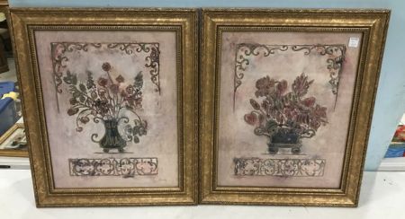 751 Pair of Hand Colored Block Print of Urn with Flowers