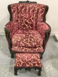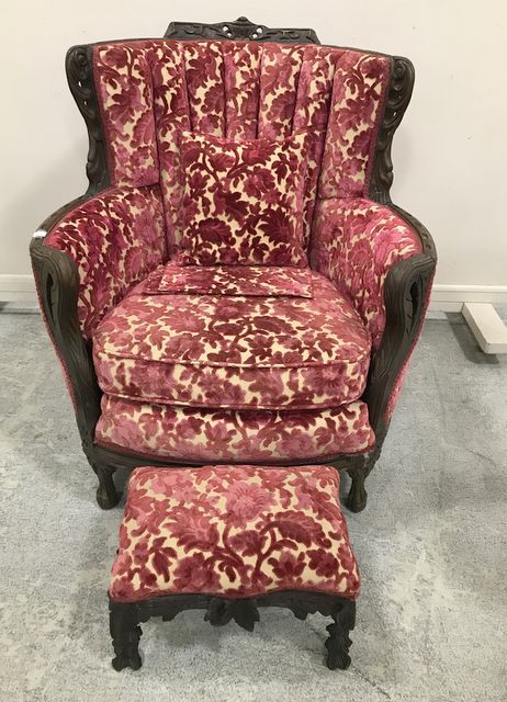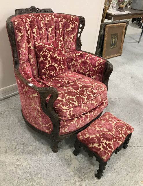Vintage Victorian Style Chair and Ottoman, carved wood frame with feet, ottoman leaf carved ottoman. Vintage Victorian Style Chair and Ottoman, carved wood frame with feet, ottoman leaf carved ottoman.