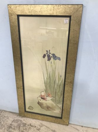 Sakai Hoitsu Reproduction Titled Iris & Mandarin Ducks by eighteenth century artist Hoitsu, original is hanging in the Dallas Museum of Fine arts, framed 37"h., 18"w. Sakai Hoitsu Reproduction Titled Iris & Mandarin Ducks by eighteenth century artist Hoitsu, original is hanging in the Dallas Museum of Fine arts, framed 37"h., 18"w.