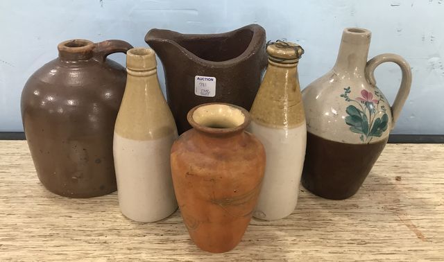 Brownware pottery pitcher 8"h., crock, two crock bottles, liquor bottle, vase. Brownware pottery pitcher 8"h., crock, two crock bottles, liquor bottle, vase.