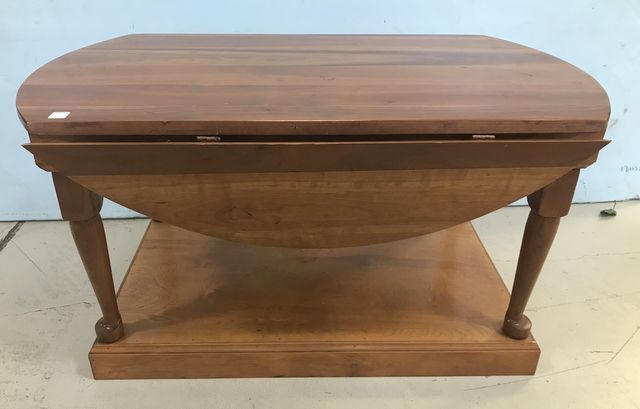 Cherry Drop Leaf Coffee Table On Base, rectangle to oval coffee table attached to wood base, 22"h., 41"w., 24"d unopened. Cherry Drop Leaf Coffee Table On Base, rectangle to oval coffee table attached to wood base, 22"h., 41"w., 24"d unopened.