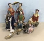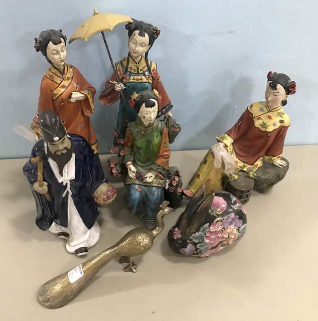 Set of Maidens, Andrea pottery rabbit, Chinese pottery man, resin Maiden umbrella, India brass peacock. Set of Maidens, Andrea pottery rabbit, Chinese pottery man, resin Maiden umbrella, India brass peacock.