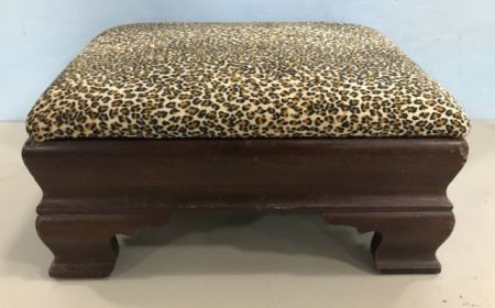 Vintage Empire Style Mahogany Footstool, leopard print fabric top, has finish wear, 8"h., 16"w. Vintage Empire Style Mahogany Footstool, leopard print fabric top, has finish wear, 8"h., 16"w.