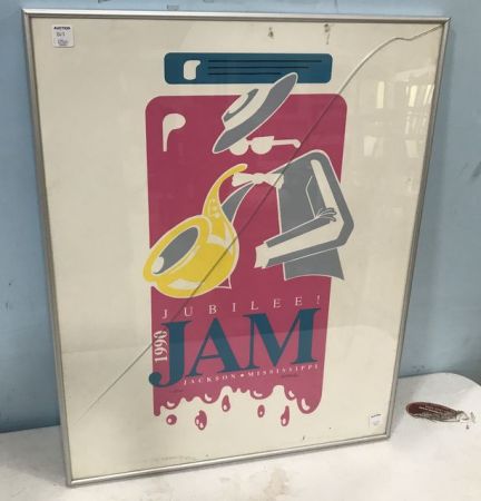 1990 Jubilee jam signed poster, Jackson, Mississippi, numbered 309/500, crack in glass, 29"h., 23"w. 1990 Jubilee jam signed poster, Jackson, Mississippi, numbered 309/500, crack in glass, 29"h., 23"w.
