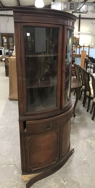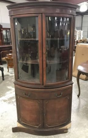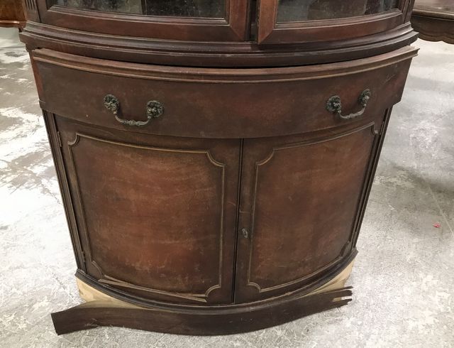 Vintage Duncan Phyfe Corner Cabinet, this is a project piece, double door top and bottom, single drawer is warped, has veneer and trim issues on base, 74"h., 37"w. Vintage Duncan Phyfe Corner Cabinet, this is a project piece, double door top and bottom, single drawer is warped, has veneer and trim issues on base, 74"h., 37"w.