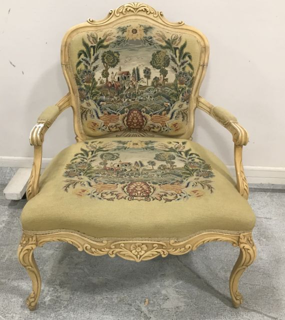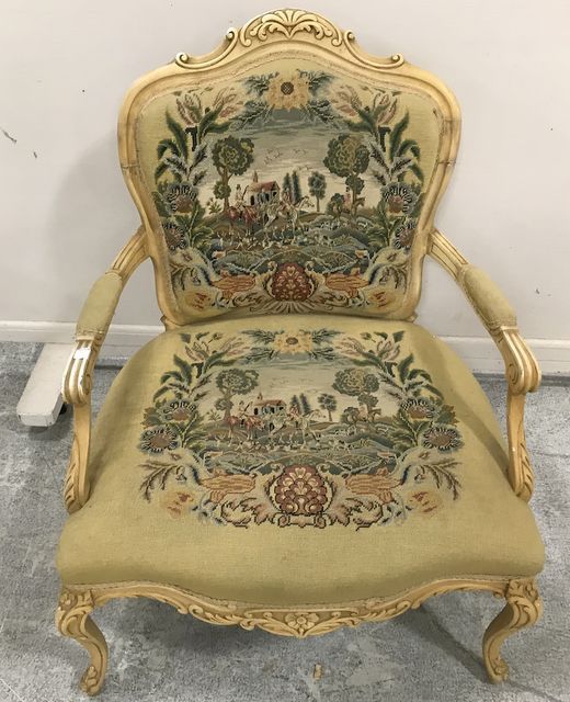Painted French Provincial Large Arm Chair, European scene upholstery, wood carved frame, 38"h. Painted French Provincial Large Arm Chair, European scene upholstery, wood carved frame, 38"h.
