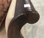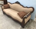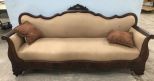 Antique Empire style sofa, burl mahogany veneer finish, carved back crest, on wheels, upholstery has stain spots, two pillows, has some wear, slight crack on right arm, 38"h., 82"w. Antique Empire style sofa, burl mahogany veneer finish, carved back crest, on wheels, upholstery has stain spots, two pillows, has some wear, slight crack on right arm, 38"h., 82"w.