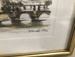 Framed Pen and Watercolor of City View Bridge European, Signed, frame is 9"h., 13"w. Framed Pen and Watercolor of City View Bridge European, Signed, frame is 9"h., 13"w.