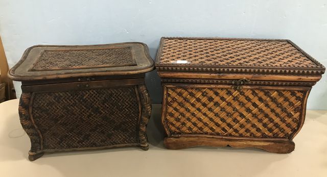 Two Modern Woven Storage Boxes, lift top boxes, one has handles, largest is 11"h., 17"w. Two Modern Woven Storage Boxes, lift top boxes, one has handles, largest is 11"h., 17"w.