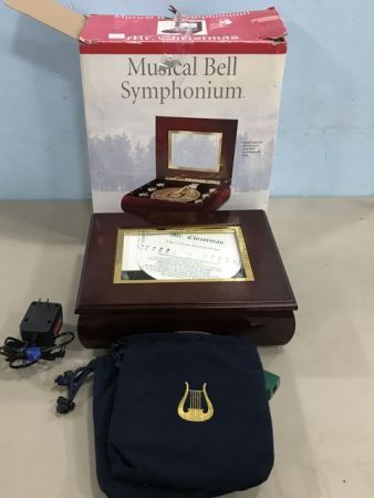 Musical Bell Symphonium Mr. Christmas, wood music box plays 16 great songs with interchangeable disks, electric, in box. Musical Bell Symphonium Mr. Christmas, wood music box plays 16 great songs with interchangeable disks, electric, in box.