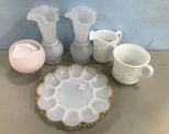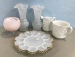 Milk glass egg tray with gold painted rim 10"dia., frost white crimped glass vases, milk glass creamer and sugar, frost white glass stem. Milk glass egg tray with gold painted rim 10"dia., frost white crimped glass vases, milk glass creamer and sugar, frost white glass stem.
