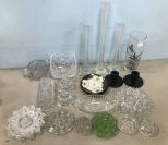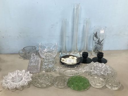 Glass flutes, butter dish, plates, frogger glass, black glass candle holders, and hand painted saucer, silver inlay geese glass vase. Glass flutes, butter dish, plates, frogger glass, black glass candle holders, and hand painted saucer, silver inlay geese glass vase.
