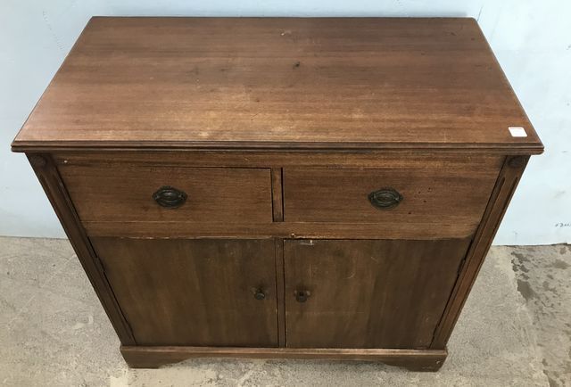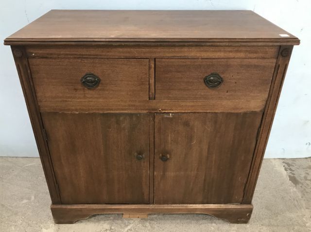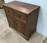 Striped mahogany server cabinet, 2 drawer, double door storage, has wear, 34"h., 36"w., 18"d. Striped mahogany server cabinet, 2 drawer, double door storage, has wear, 34"h., 36"w., 18"d.