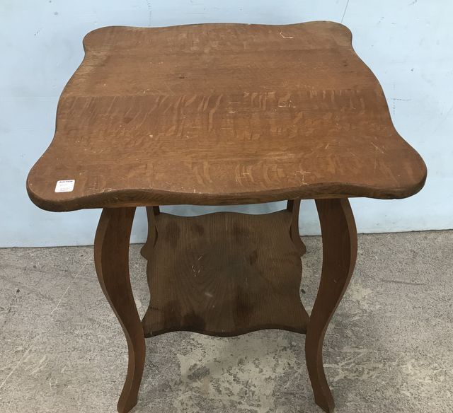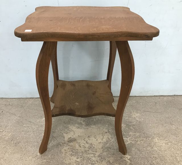 Chestnut Square Flare Leg Parlor Table, two tier, has some wear, needs tightening, 30"h., 24"sq. Chestnut Square Flare Leg Parlor Table, two tier, has some wear, needs tightening, 30"h., 24"sq.