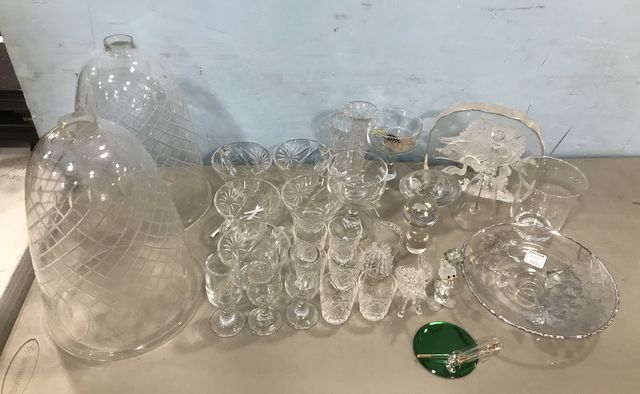 Collection of Pressed and Clear Glass Decor, silver inlaid footed dish, angel art glass, punch cups, shot glasses, pressed glass lamp shades, bell, vases. Collection of Pressed and Clear Glass Decor, silver inlaid footed dish, angel art glass, punch cups, shot glasses, pressed glass lamp shades, bell, vases.