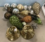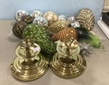 Collection of assorted Christmas ornaments, and brass candle holders. Collection of assorted Christmas ornaments, and brass candle holders.