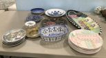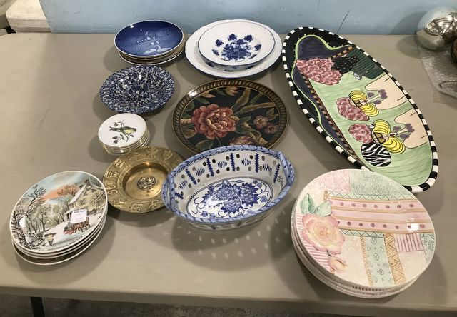 Italian hand painted plates, hand painted platter, blue and white tier plates without stand, blue and white basket, small bird dishes, stoneware blue and white candle holder, Asian hand painted gold gilt plate, Christmas plates. Italian hand painted plates, hand painted platter, blue and white tier plates without stand, blue and white basket, small bird dishes, stoneware blue and white candle holder, Asian hand painted gold gilt plate, Christmas plates.