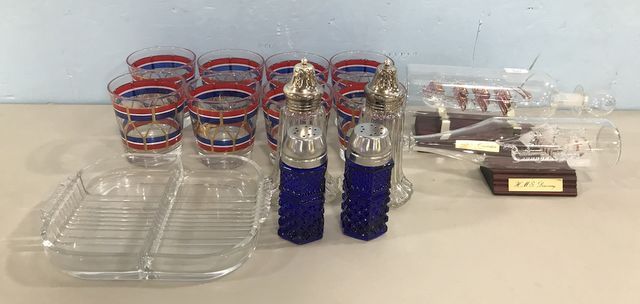 1128 Glass Lot of Cups, Salt & Pepper, and Ships